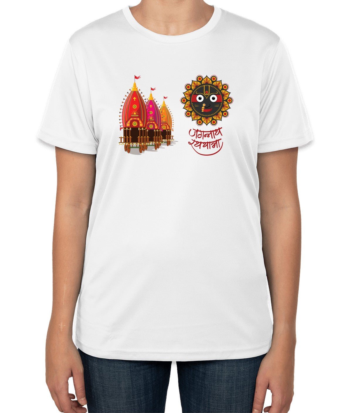 The stylish typography adds a cultural and festive touch to the T-shirt, making it a meaningful piece to wear during Jagannath Rath Yatra celebrations or as a thoughtful gift to convey blessings and joy.