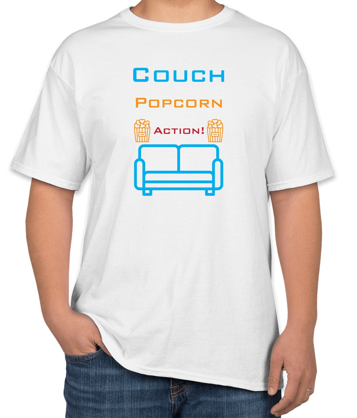Pair this T-shirt with comfy pajama pants or jeans for a laid-back look that’s perfect for a casual hangout or an evening at home with friends and family. The playful "Couch Popcorn Action!" text is sure to resonate with any movie buff and bring a smile to your face.